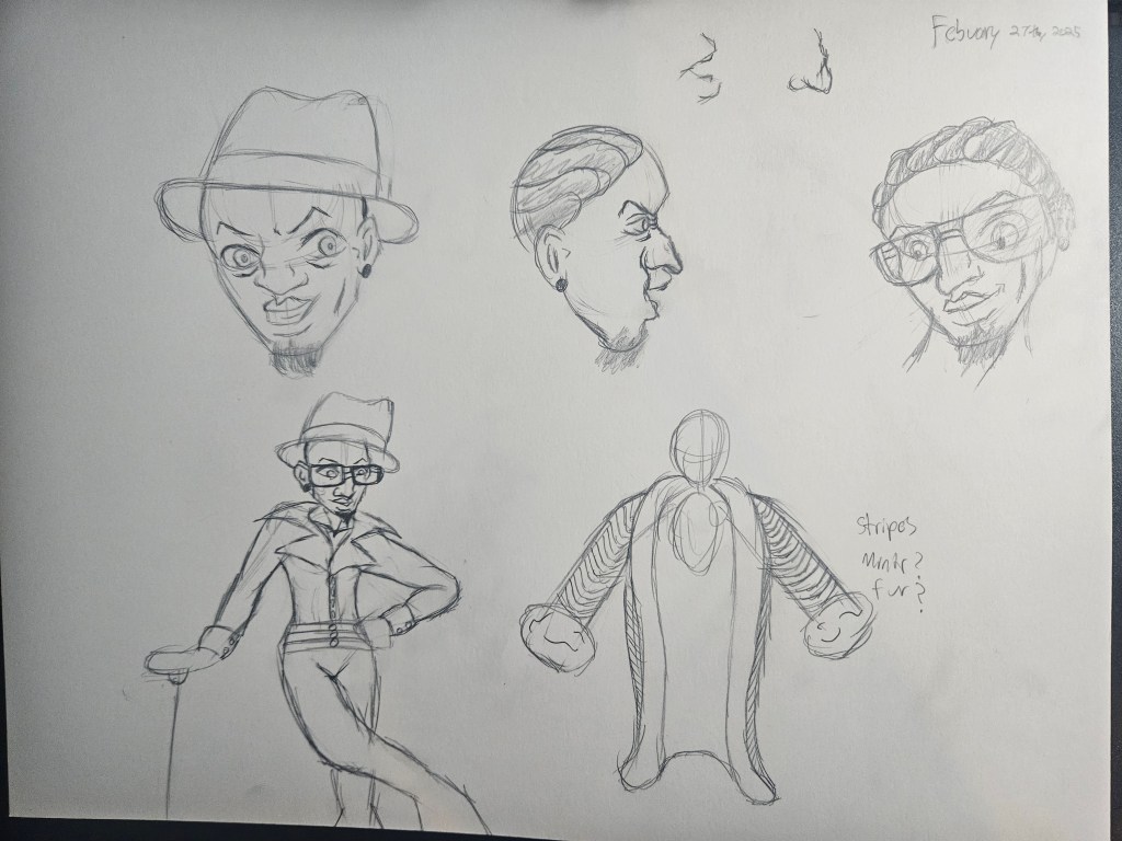 I didn’t have a specific image in mind when designing him, I looked up Black pimp fashion. I tried to stay in the 1970’s, to me that where Black pimp fashion peaked, but also I just really like how Black people dressed then. When I think of pimps, I think large and exaggerated. I gave him a shirt with a big collar, big hat, a huge mink coat, and some big glasses. When I think of someone well dressed, I think they would have a lot of accessories and not just the clothes on their back. Originally he didn’t have glasses, but I think it added something and I thought giving him bad eyesight would be interesting. It’s something small, but I think it adds a layer to him. He’s a little vulnerable like the rest of us. For his hair, I’m not exactly sure what to call it but Suga Free, a know pimp/rapper, had that hair style in his “On My Way” music video. I love the natural hair of Black people, but I just love how there’s just so many ways to style it. I also think of old Motown singers and they way they had their hair, but I feel like it’s a little different. Also with a style like this, you can tell Superfly spends a lot of time on his hair and more importantly his appearance. As someone with waves, it takes a lot time to style hair that fine. I gave him a cane too, but I don’t have to explain that, pimp canes are just cool.